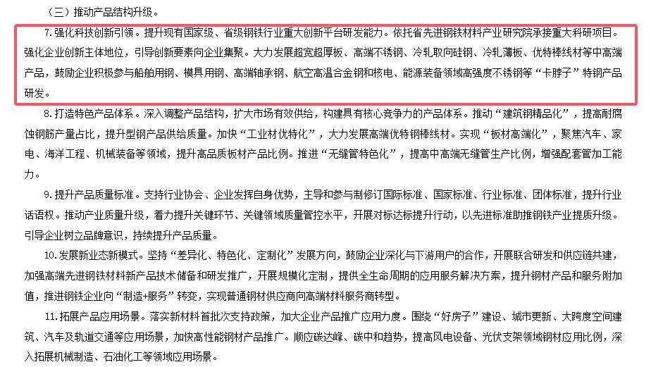 其中,在《河南省鋼鐵產(chǎn)業(yè)提質(zhì)升級行動計劃》中提到將強化科技創(chuàng)新引領(lǐng)。提升現(xiàn)有國家級、省級鋼鐵行業(yè)重大創(chuàng)新平臺研發(fā)能力。依托省先進鋼鐵材料產(chǎn)業(yè)研究院承接重大科研項目。強化企業(yè)創(chuàng)新主體地位,引導(dǎo)創(chuàng)新要素向企業(yè)集聚。大力發(fā)展超寬超厚板、高端不銹鋼、冷軋取向硅鋼、冷軋薄板、優(yōu)特棒線材等中高端產(chǎn)品,鼓勵企業(yè)積極參與船舶用鋼、模具用鋼、高端軸承鋼、航空高溫合金鋼和核電、能源裝備領(lǐng)域高強度不銹鋼等“卡脖子”特鋼產(chǎn)品研發(fā)。